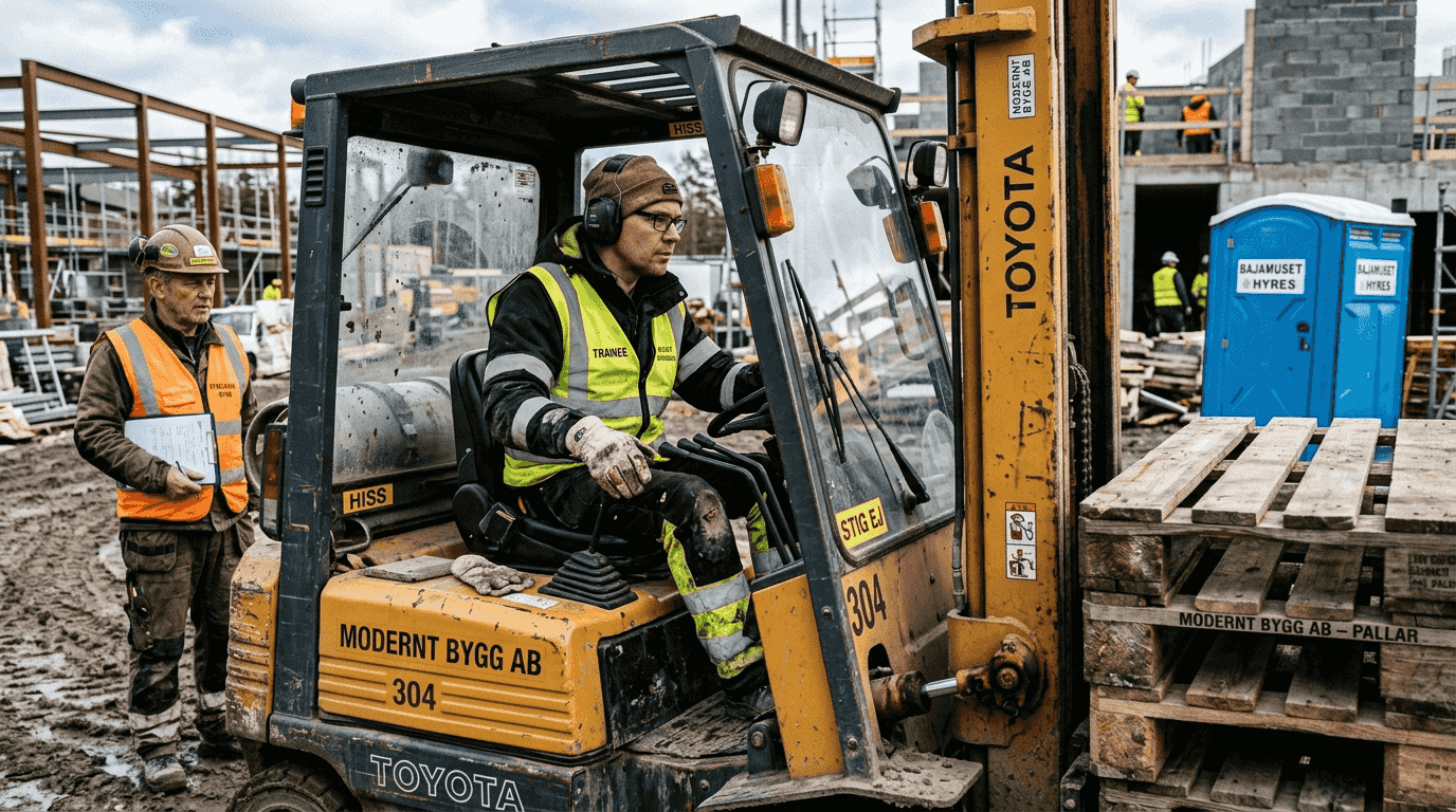 Truckkort och traversutbildningar är nödvändiga för säker materialhantering på byggplatser. Olika truckcertifikat gäller för olika maskintyper: motviktstruck, skjutstativtruck och teleskoplastare kräver separata utbildningar. Traversutbildning behövs när medarbetare ska manövrera kranar för tunga lyft.